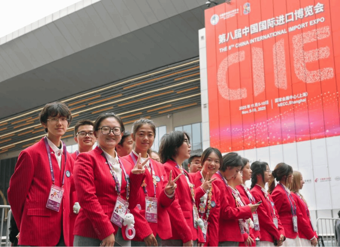 Volunteers are pictured at the eighth China International Import Expo (CIIE) in east China's Shanghai, Nov. 5, 2025. (Xinhua/Liu Ying)